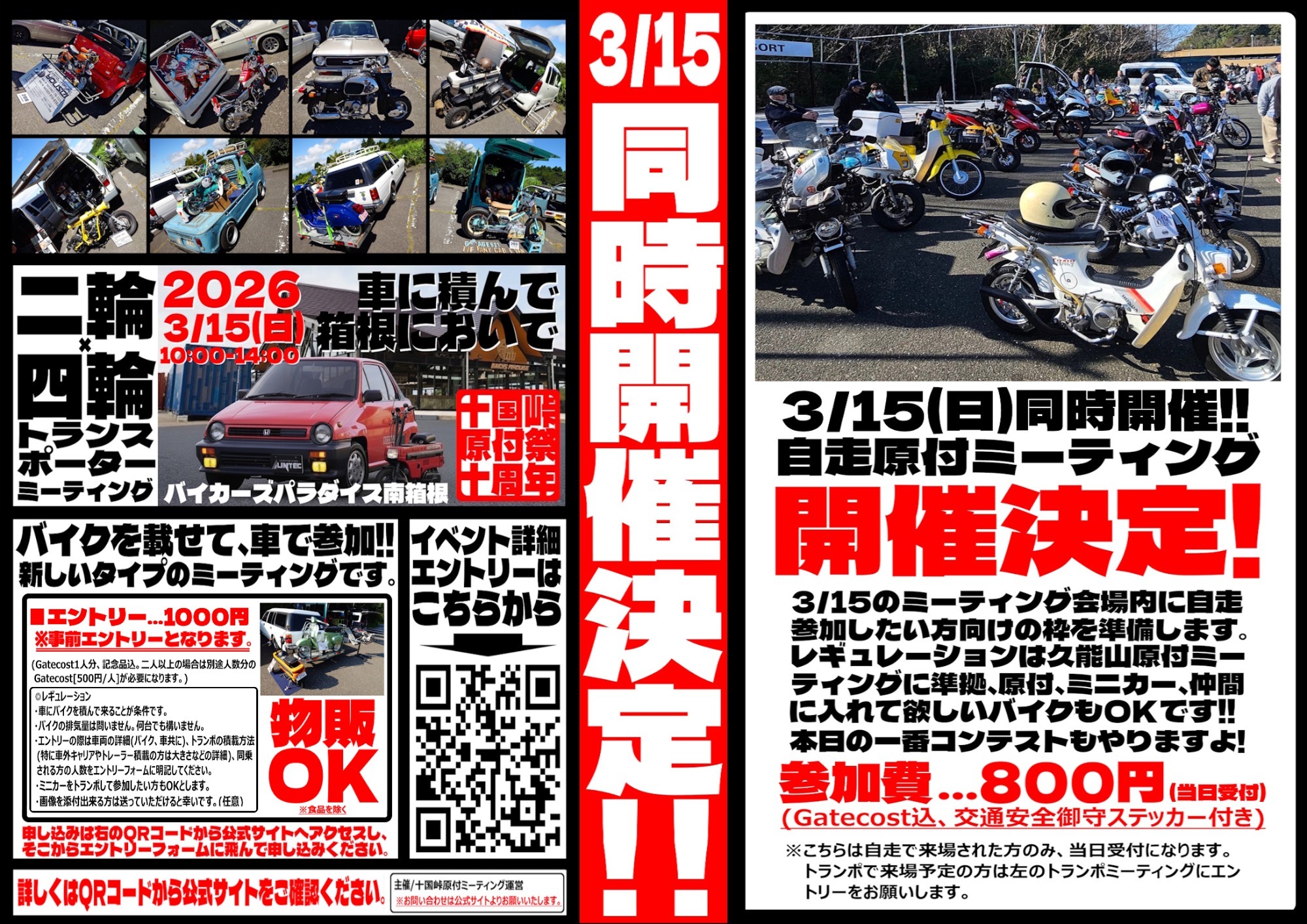 3/15二輪×四輪トランスポーターミーティングの会場内で自走原付ミーティングの開催が決定しました。